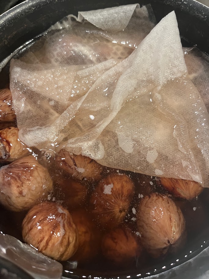 3度目のアク抜きを終え、水洗いし、栗の重さの60%のグラニュー糖で40分煮た。